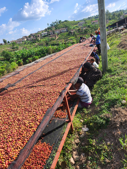 This coffee was processed at Rwamatamu’s Mbare washing station, situated in Muhanga, Southern Province. Once it arrives, the coffee is spread out to dry on raised beds and sorted by hand. Over the 26-33 days they take to dry, the cherries are turned and further sorted while the sugars and fruit flavours seep into the bean. The coffee then gets taken to the milling facilities in Kigali, where the coffee is dehusked, polished, and graded.